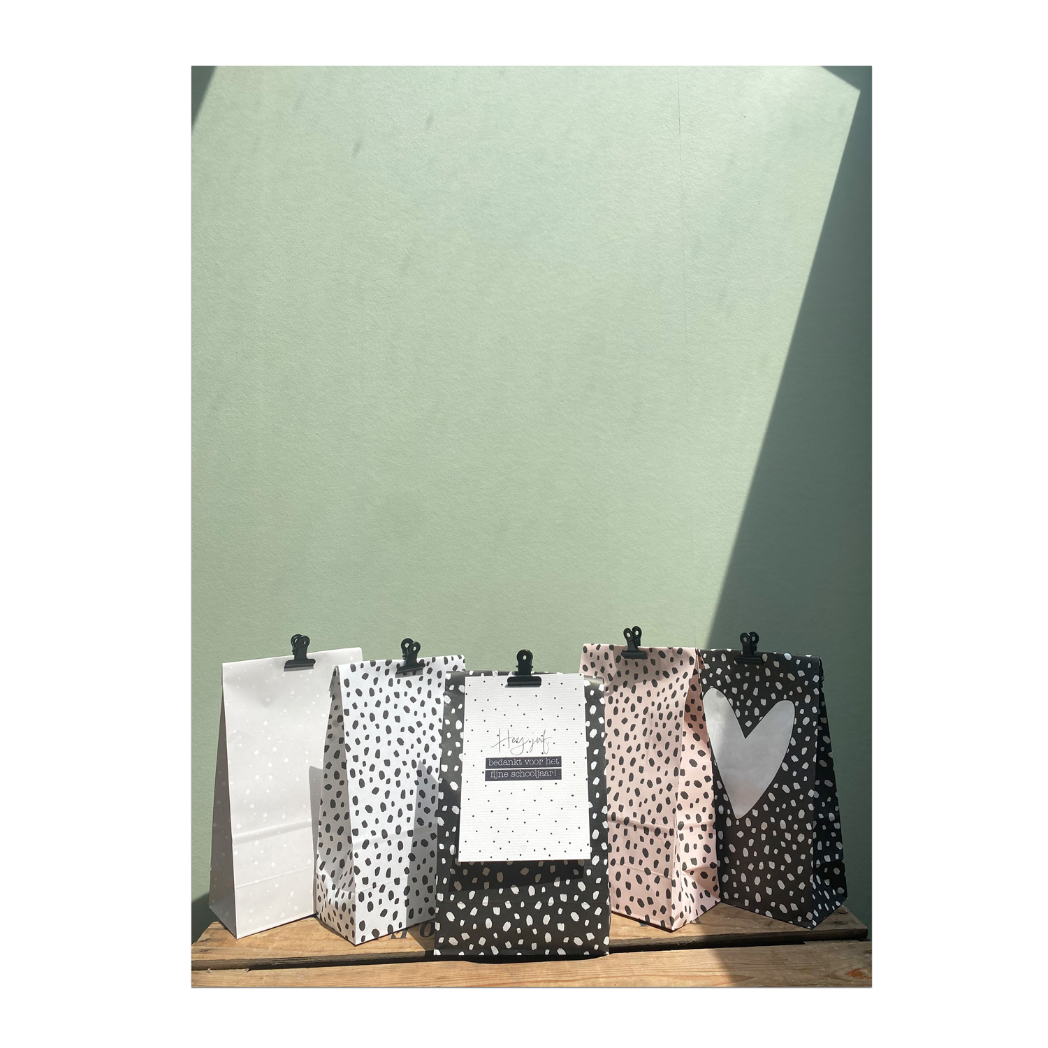 Een leuk kraft papier cadeauzak. Ideaal voor het maken van bedankjes, traktaties en het verpakken van cadeaus als chocola, zeep, sieraden, etc. De cadeauzak maak je eenvoudig dicht met bijgeleverd zwarte clip. Schrijf een kaart met een mooie wens en maak die met de clip vast aan het zakje. Klaar is je cadeau! Super makkelijk en zo gepiept.