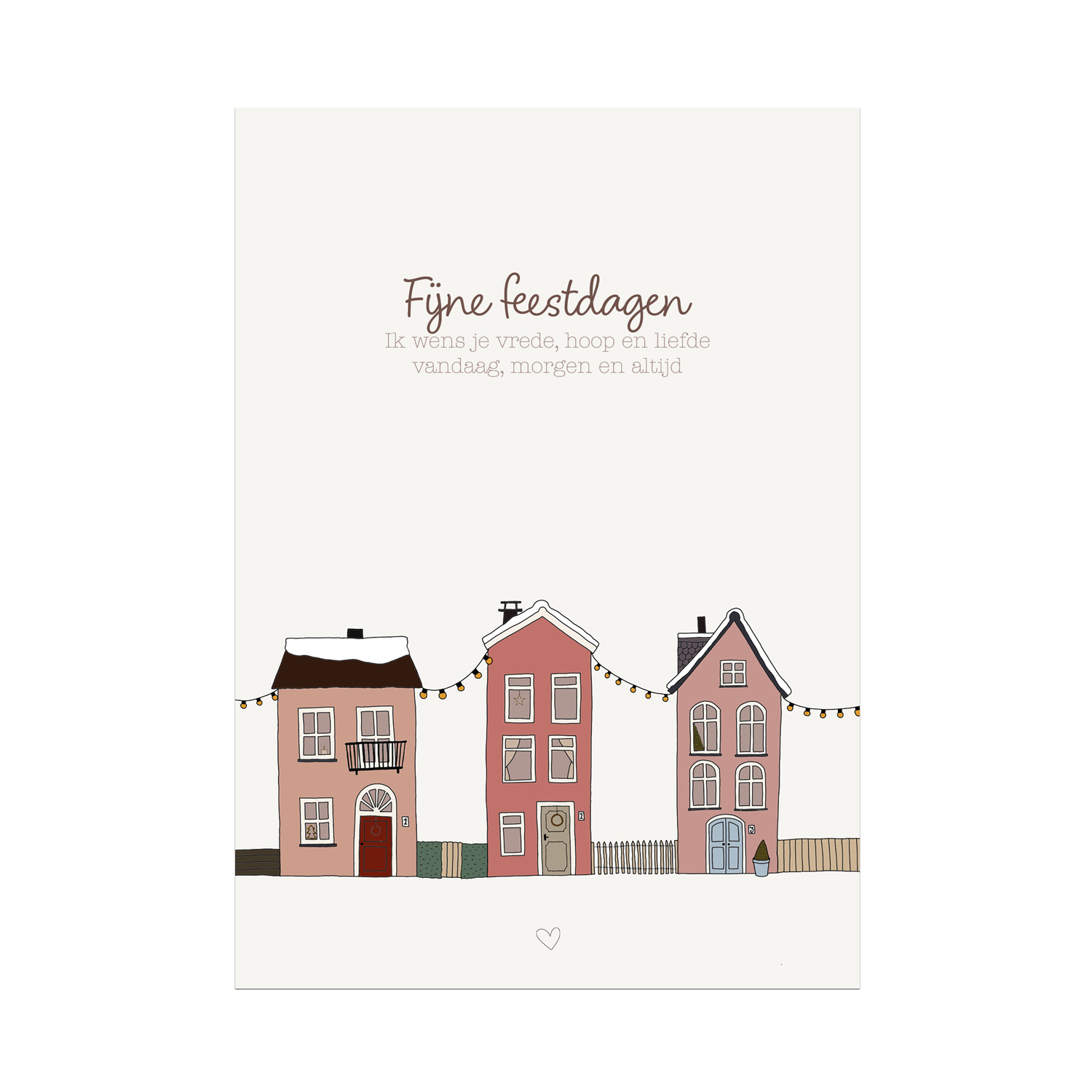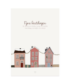 Kerstkaart met huisjes en tekst Fijne Feestdagen